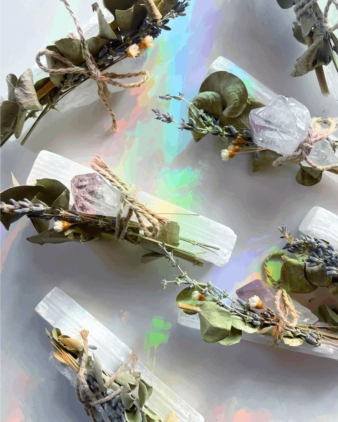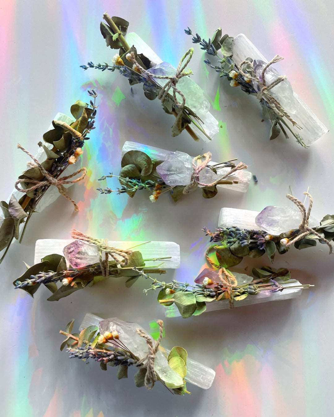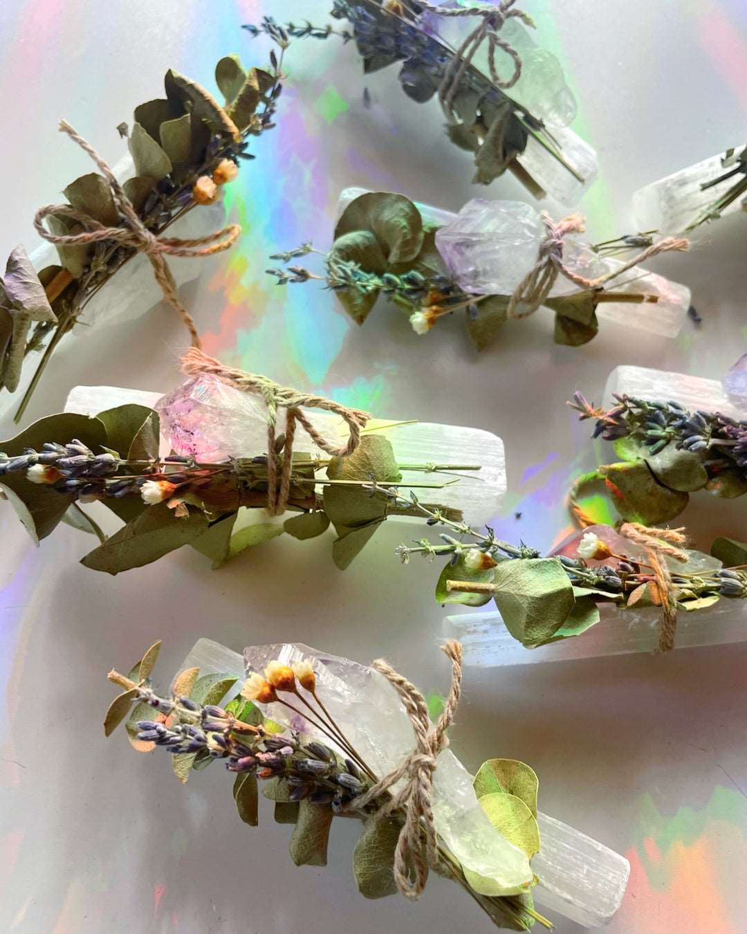 This Amethyst & Selenite Bundle is the perfect tool to cleanse and protect. The selenite from Morocco brings a powerful cleansing energy to any space, while the amethyst from Brazil is known for its ability to clear away any negative energy. Complete with dried flowers; eucalyptus, lavender, and Brazilian star daisy. This bundle brings a unique combination of healing properties and protection.