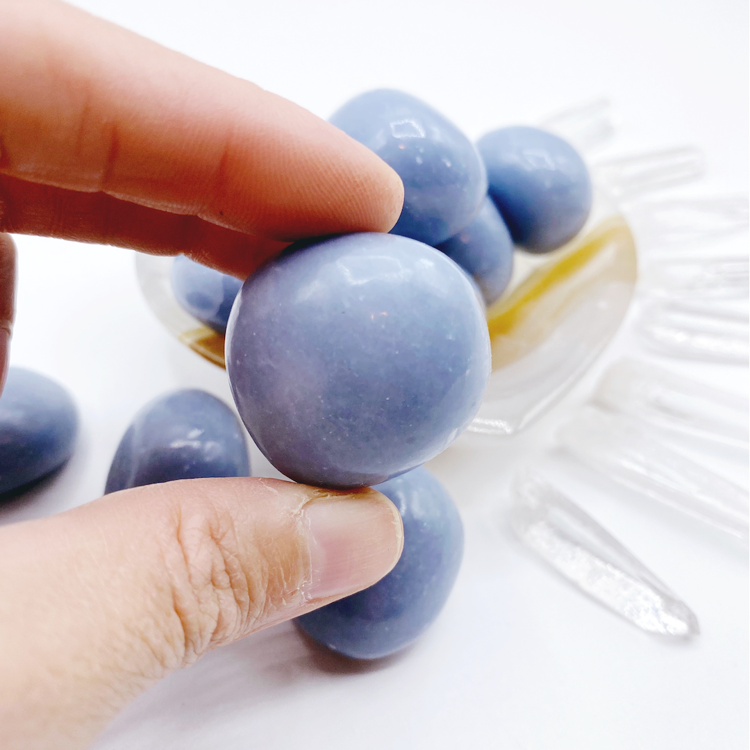 Metaphysically, Angelite tumbled stones are said to carry a calming, soothing energy, guiding to serenity and positivity. Angelites intentions to raise the state of conscious awareness. It represents peace and brotherhood, improved communication of all types and self expression. Focus on dispelling fear, stress and anxiousness. Angelite works well in communication with angelic beings and spirit guides.