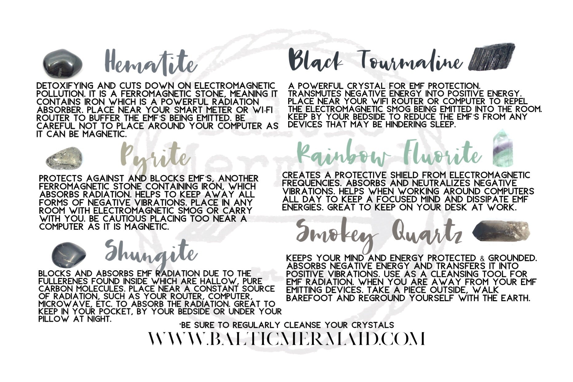 Shungite: Blocks and absorbs EMF radiation due to the fullerenes found inside which are hallow, pure carbon molecules. Place near a constant source of radiation, such as your router, computer, microwave, etc. to absorb the radiation. Great to keep in your pocket, by your bedside or under your pillow at night.