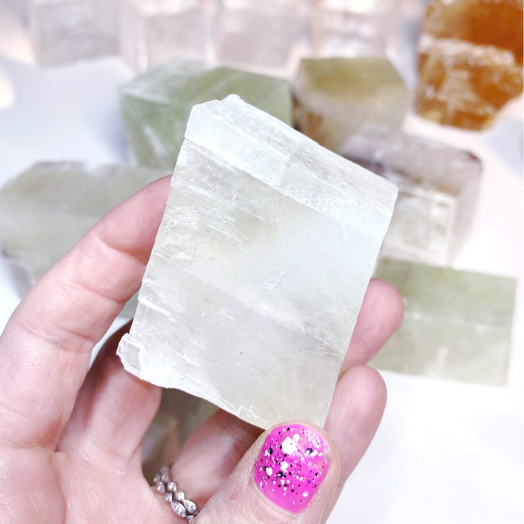 Optical Calcite, also known as Iceland Spar, offers clarity, perspective, focus and inspiration. These crystal, geometric crystals naturally form in perfect rhomboid shapes and are filled with with beautiful rainbows. Green Optic Calcite offers a gentle loving perspective.
