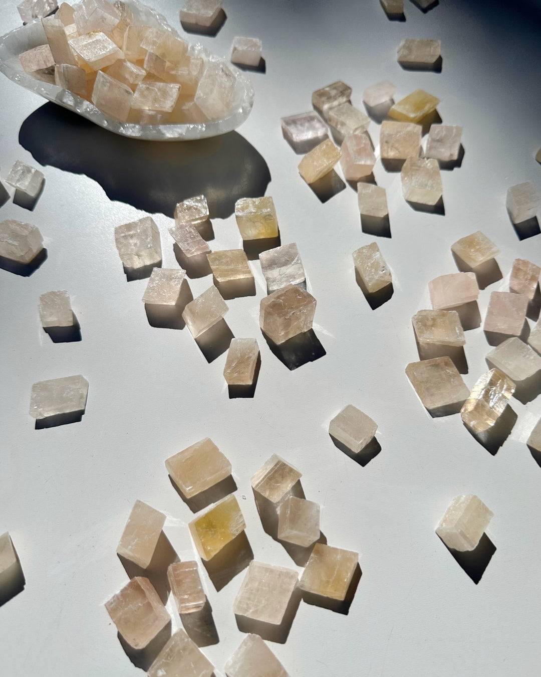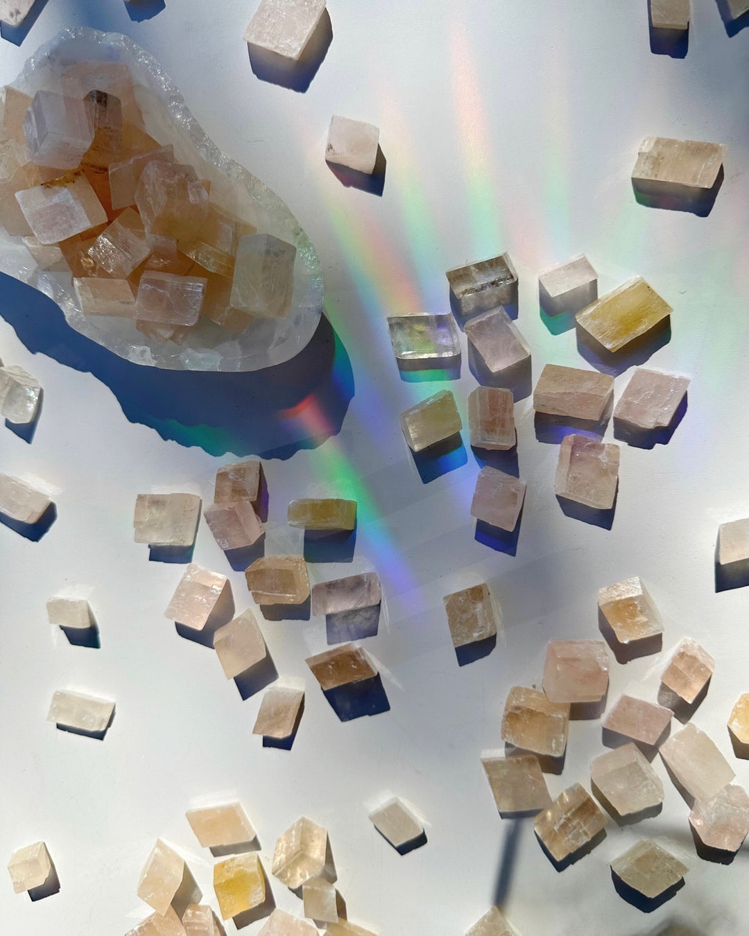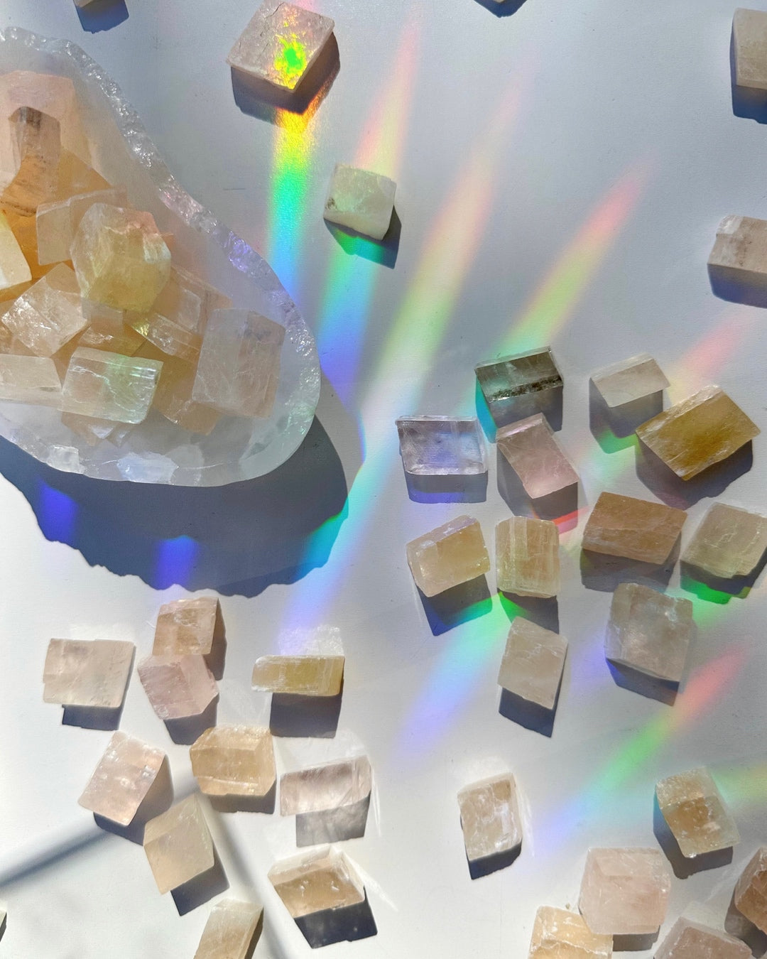 Optical calcite, also known as Iceland Spar, offers clarity, perspective, focus and inspiration. These crystal, geometric crystals naturally form in perfect rhomboid shapes and are filled with with beautiful rainbows. Pink Optic Calcite offers a gentle loving perspective. These are from Mexico and are UV reactive and will glow bright pink under a UV light