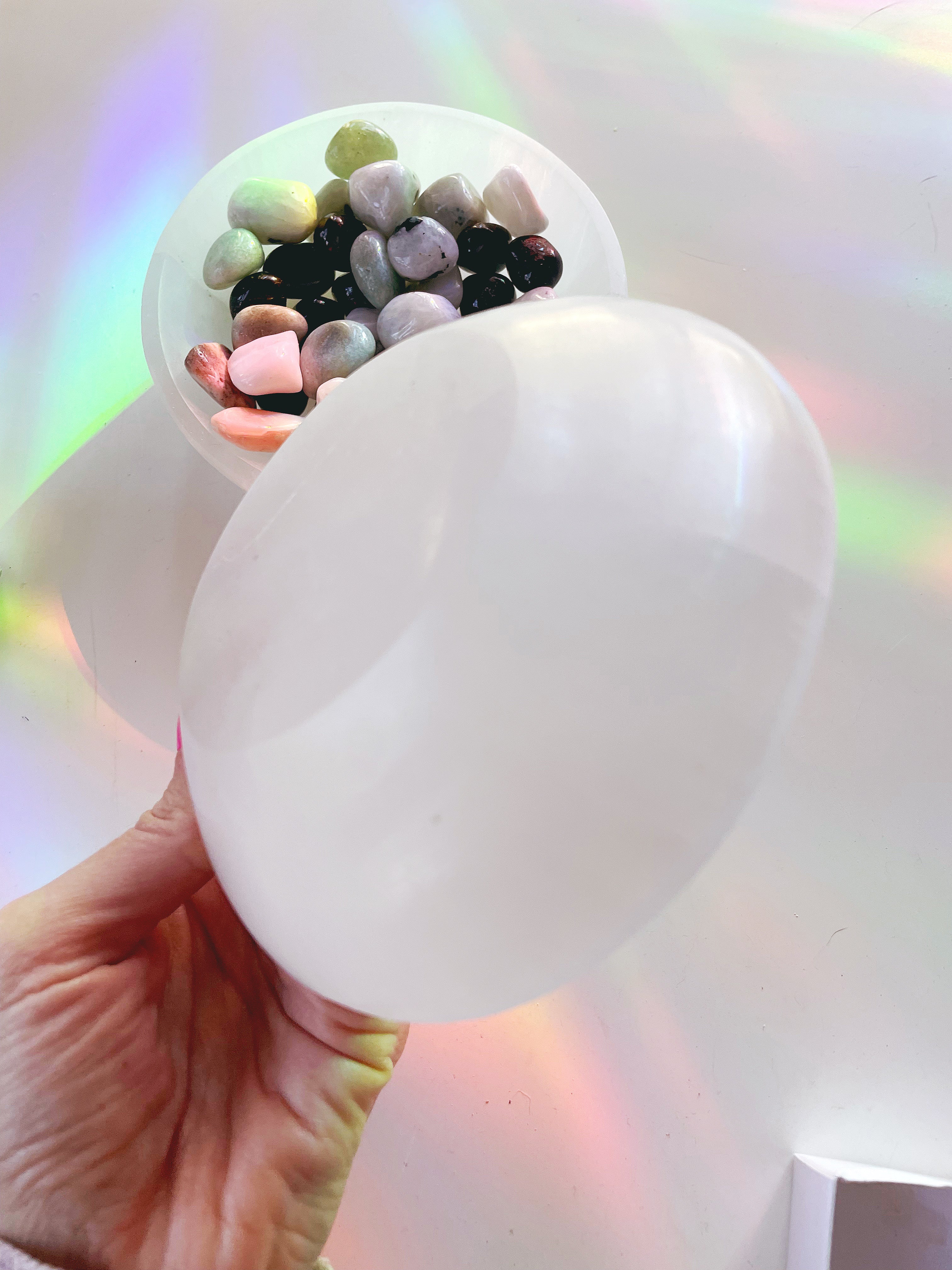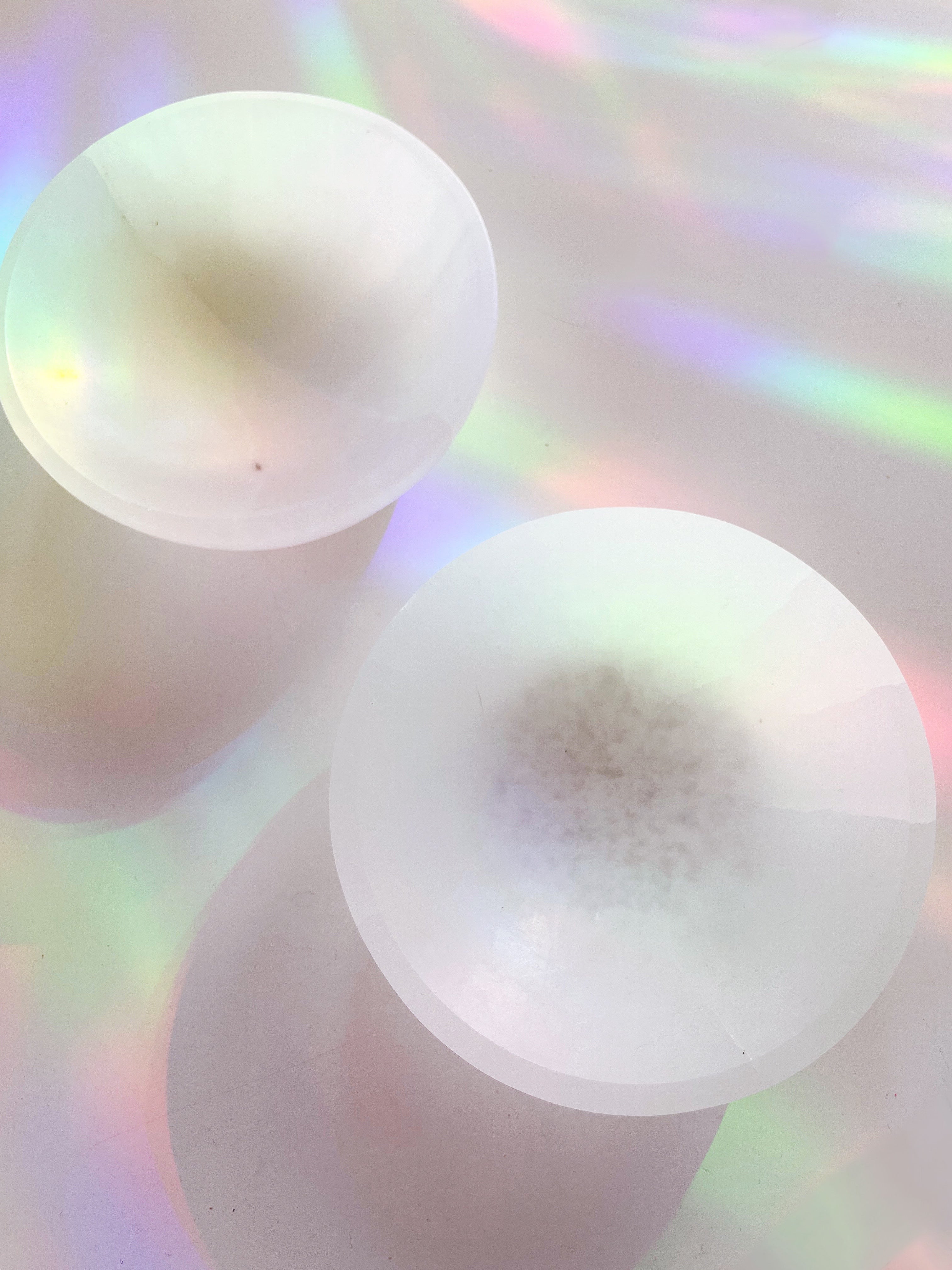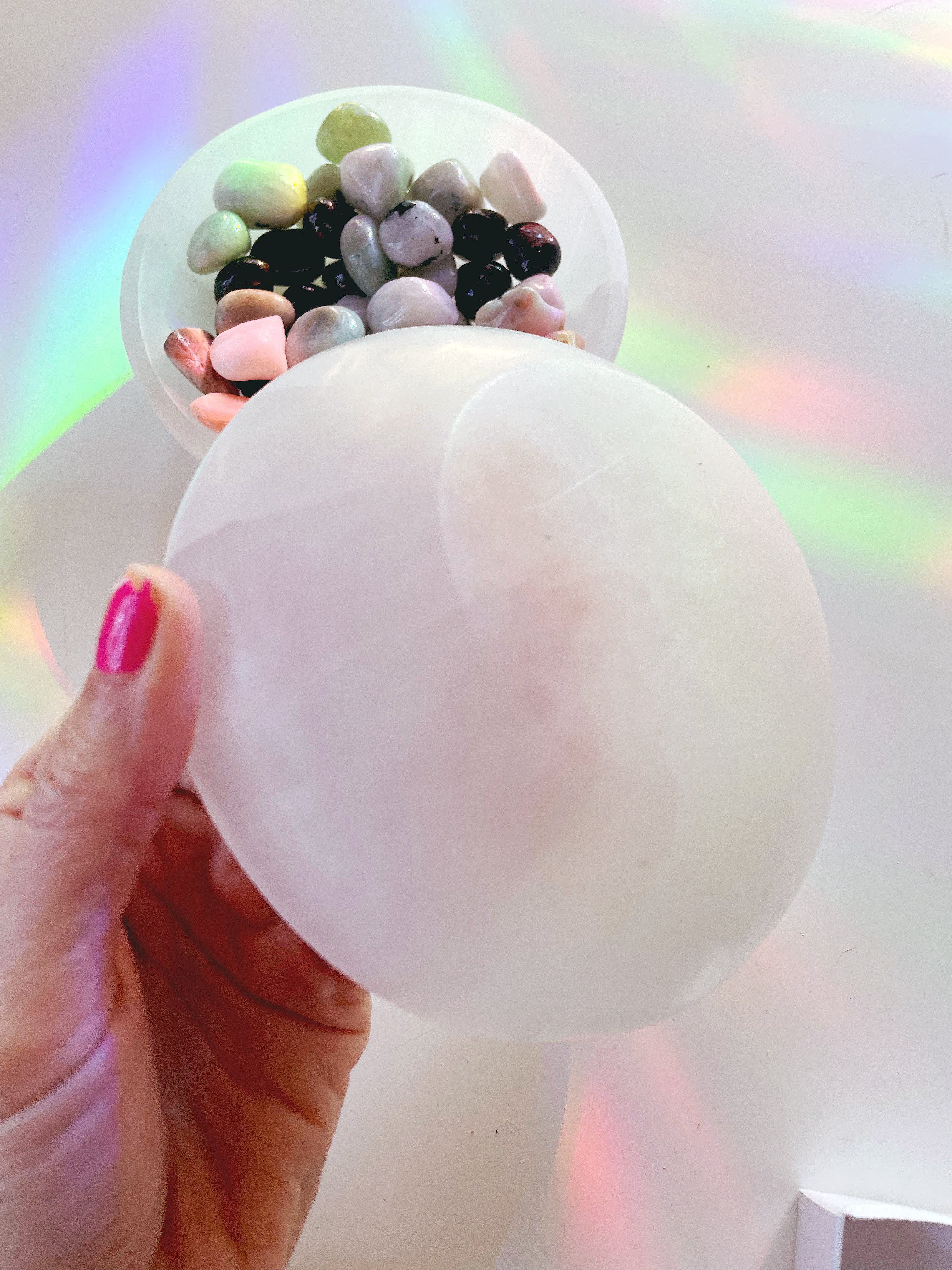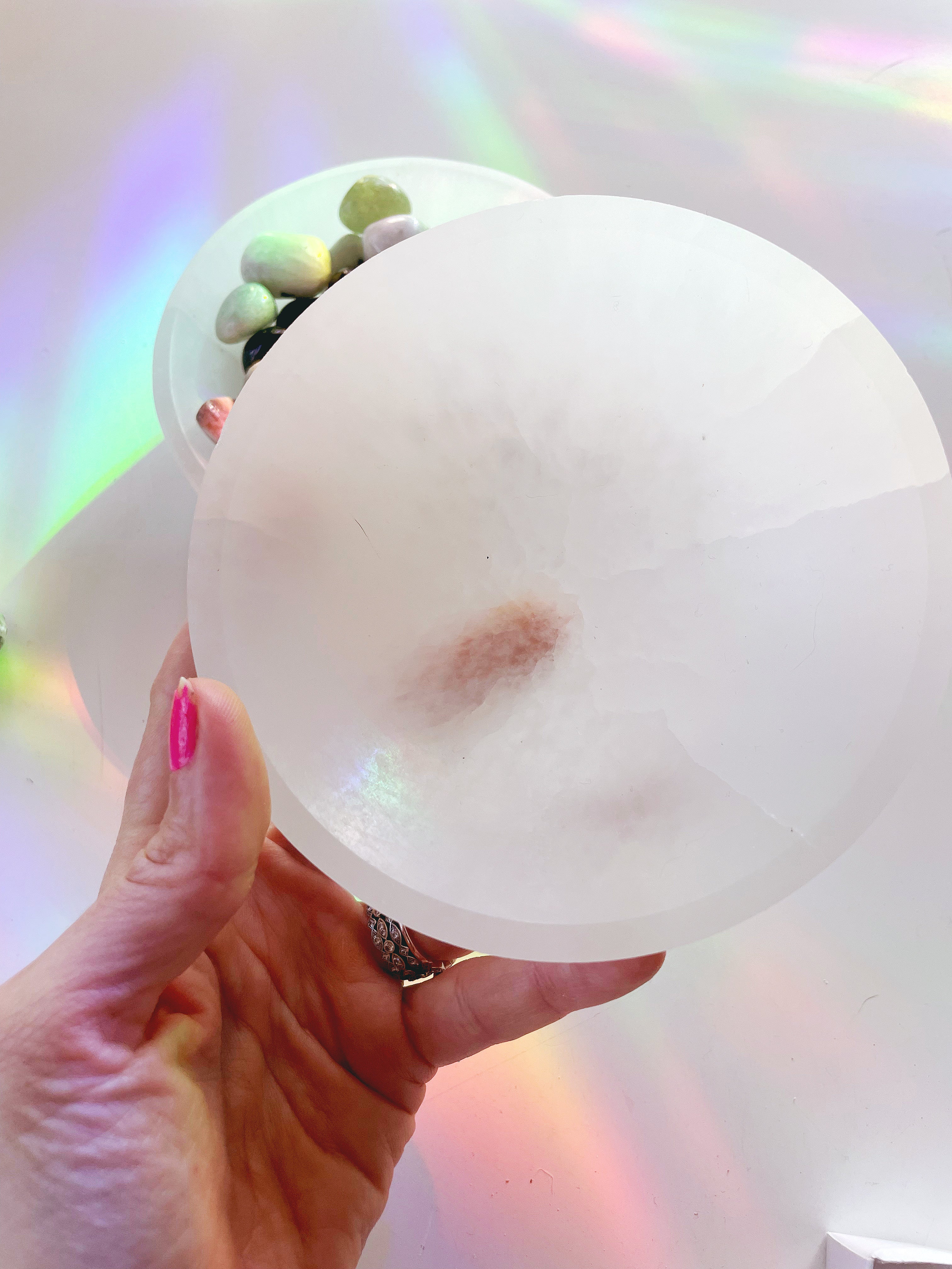 Selenite bowls are perfect for holding and cleansing tumbles stones or anything else you put inside. Price is for one selenite dish intuitively picked for you.