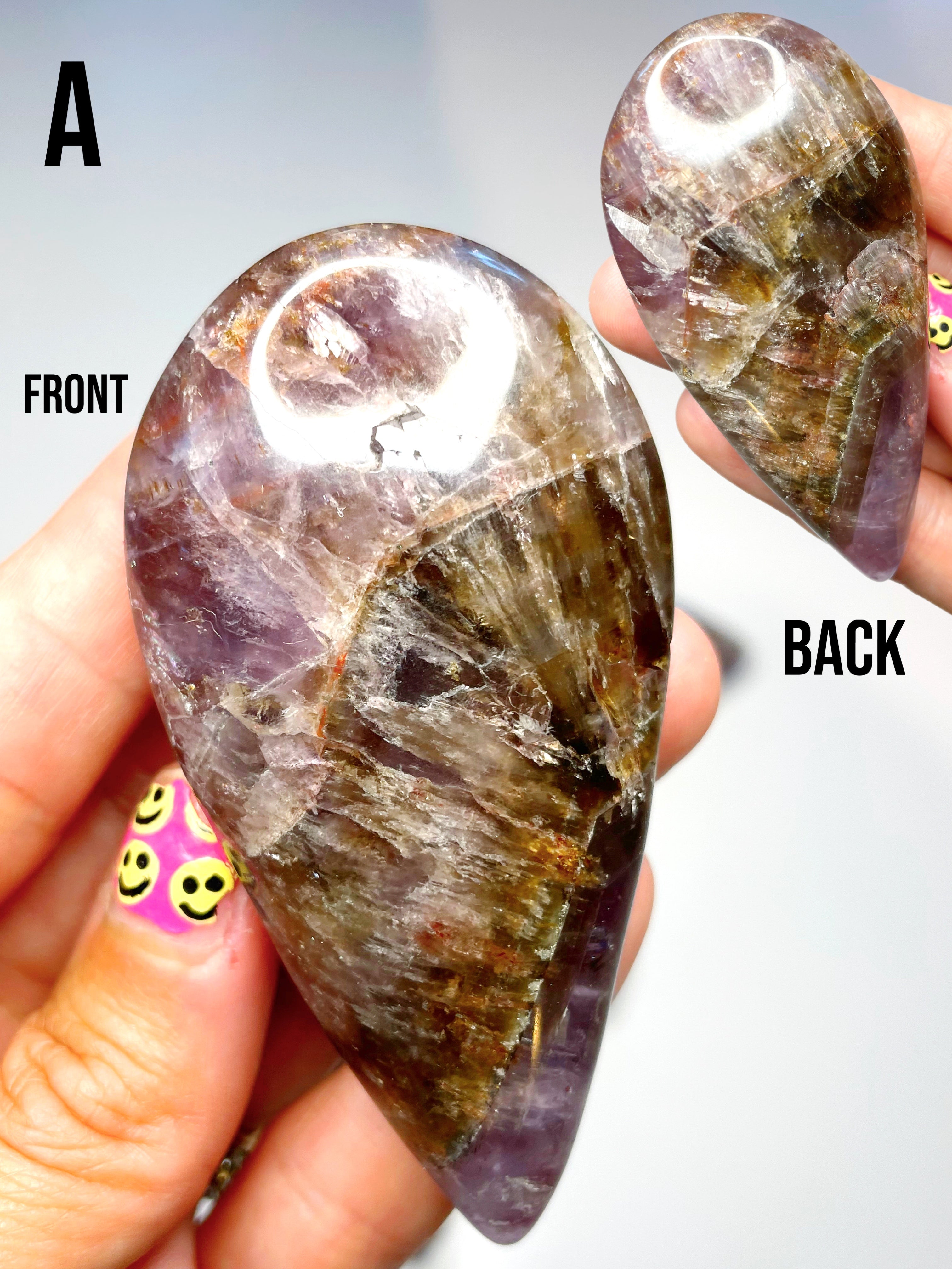 Super Seven, also called the Melodys Stone is a combination of seven stones: Amethyst, Clear Quartz, Smoky Quartz, Cacoxenite, Rutile, Goethite and Lepidocrocite. Super seven shares the healing and metaphysical properties of all seven stones. Very powerful for spiritual growth, know to have a vibration that links all humanity.  Found in the Holy Spirit, Espiritu Santo, region of Brazil.