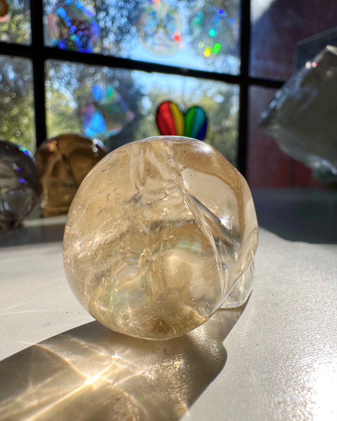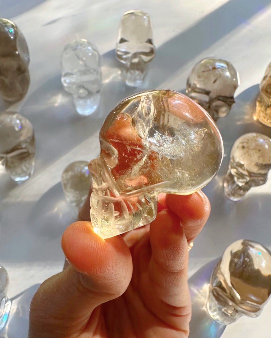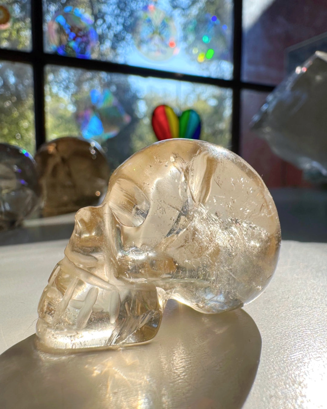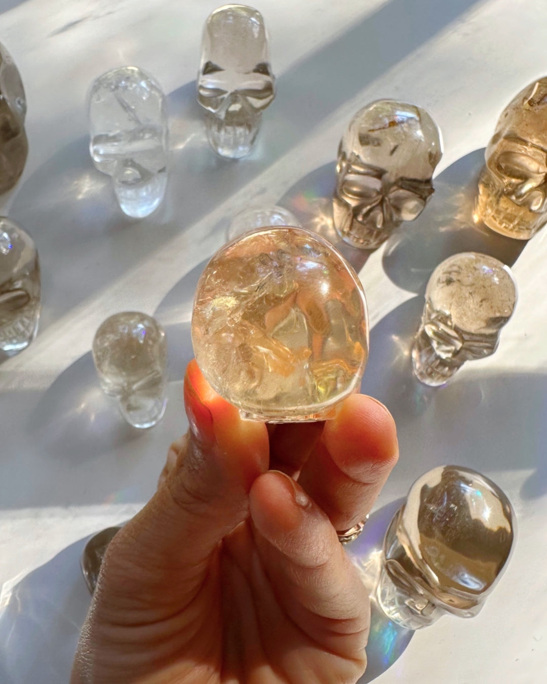 Citrine Skull, expertly hand-carved in the heart of Brazil. Crafted with precision and care, this unique piece of natural art showcases the remarkable clarity and energy of citrine.
