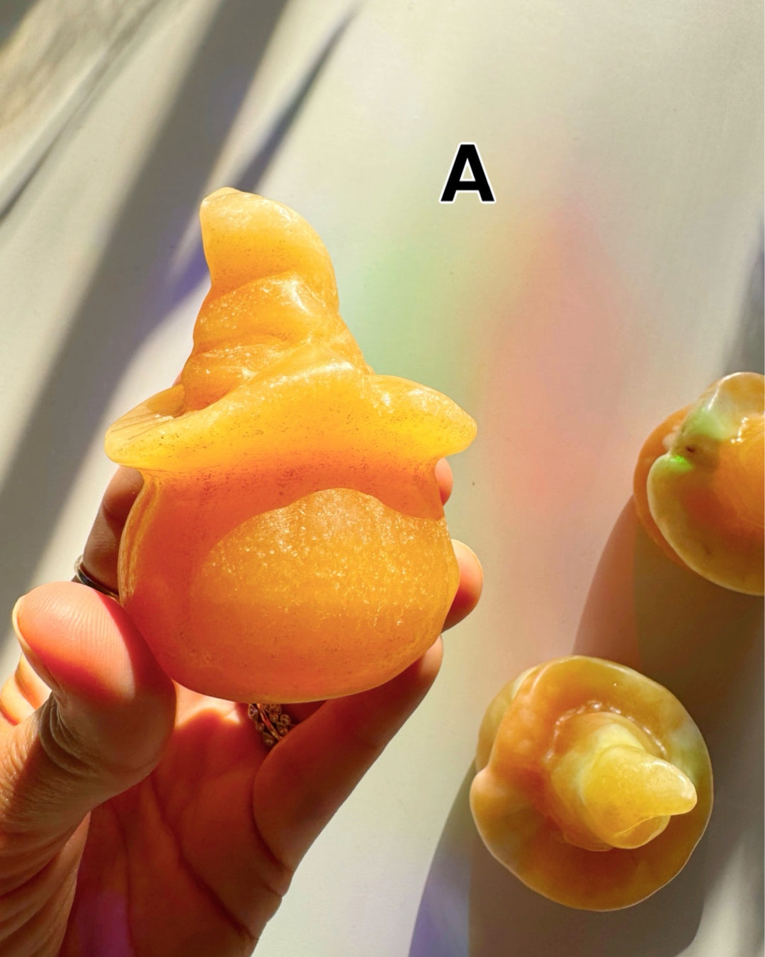 Orange calcite is known for its uplifting, energizing properties. It helps to clear out stagnant energy and get things moving—perfect for when you need a little extra boost of motivation or creativity. It’s also great for enhancing joy and positivity, so these jack-o’-lanterns aren’t just cute, they’ll brighten your mood too. Comes with a couple small lights to place inside for a festive glow