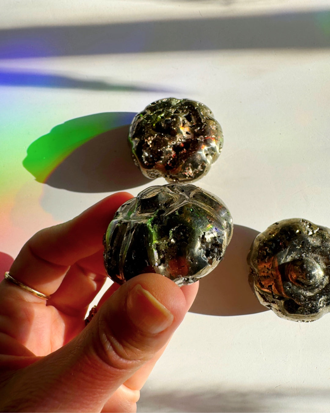 Whether you’re sprucing up your Halloween decorations or just love a little sparkle, pyrite pumpkins are a fun and powerful way to add some shine to your space. Grab yours while they last!