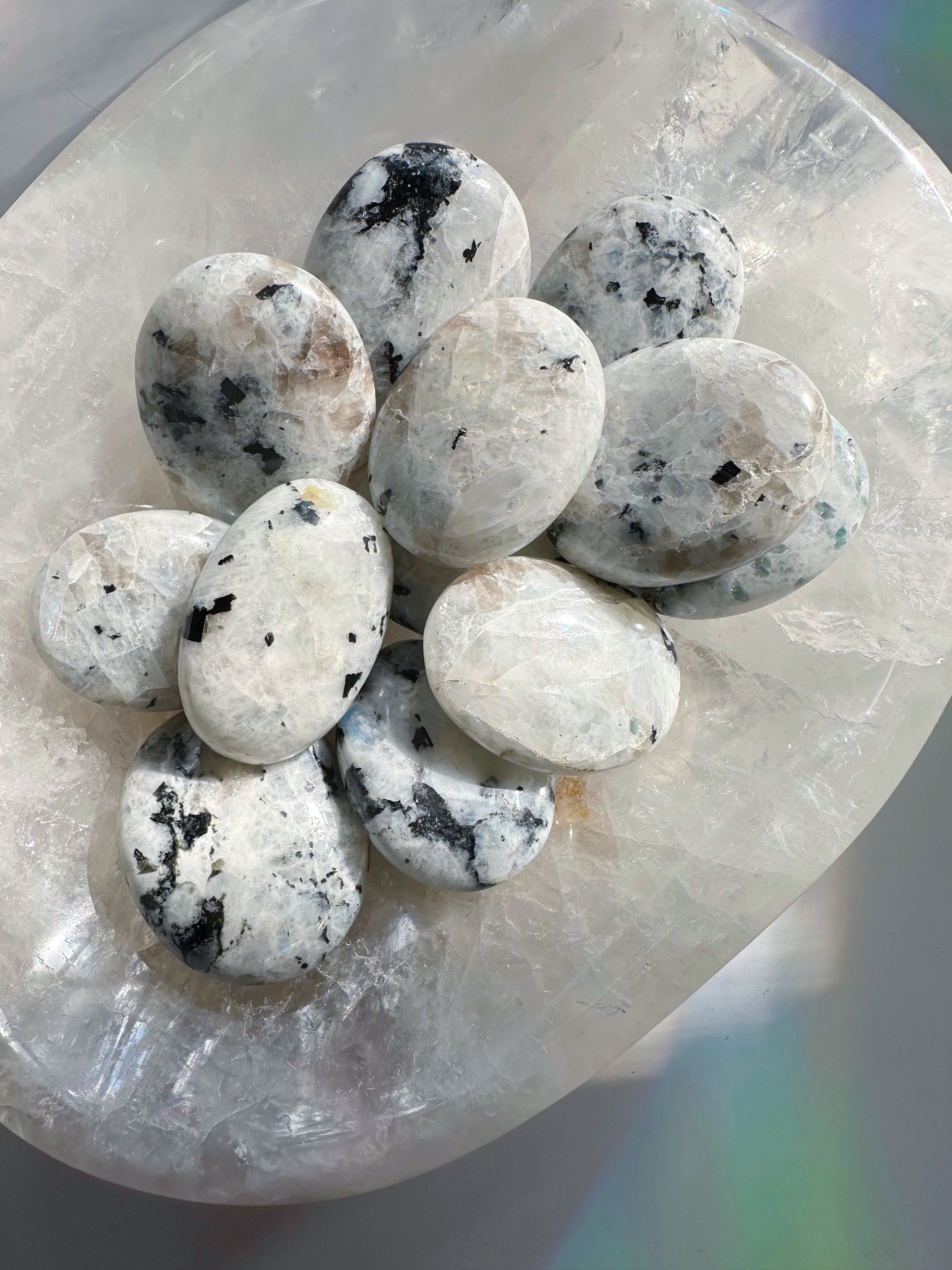 - Each Rainbow Moonstone Palm Stone is hand-picked to showcase the most vibrant flashes of color.