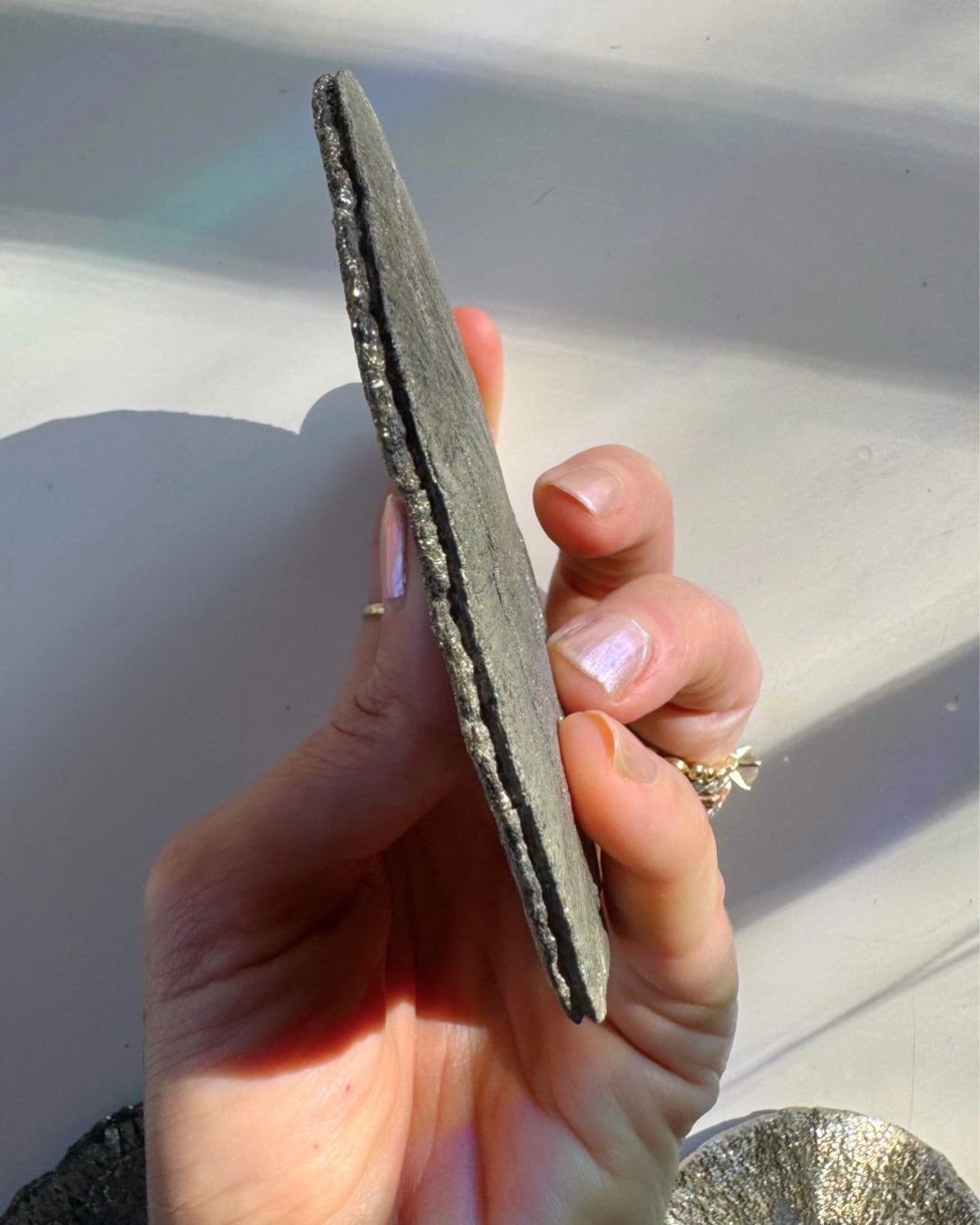 Pyrite Suns, also known as “Pyrite Dollars,” come from the coal mines of Sparta, Illinois, where they form deep underground in ancient shale deposits. Unlike typical pyrite cubes, these unique formations grow between layers of clay, radiating outward in a flat, disc-like shape. Over millions of years, pressure and mineral-rich waters create these shimmering metallic fossils that look almost like sand dollars, but instead of the ocean, they come from the Earth’s depths.