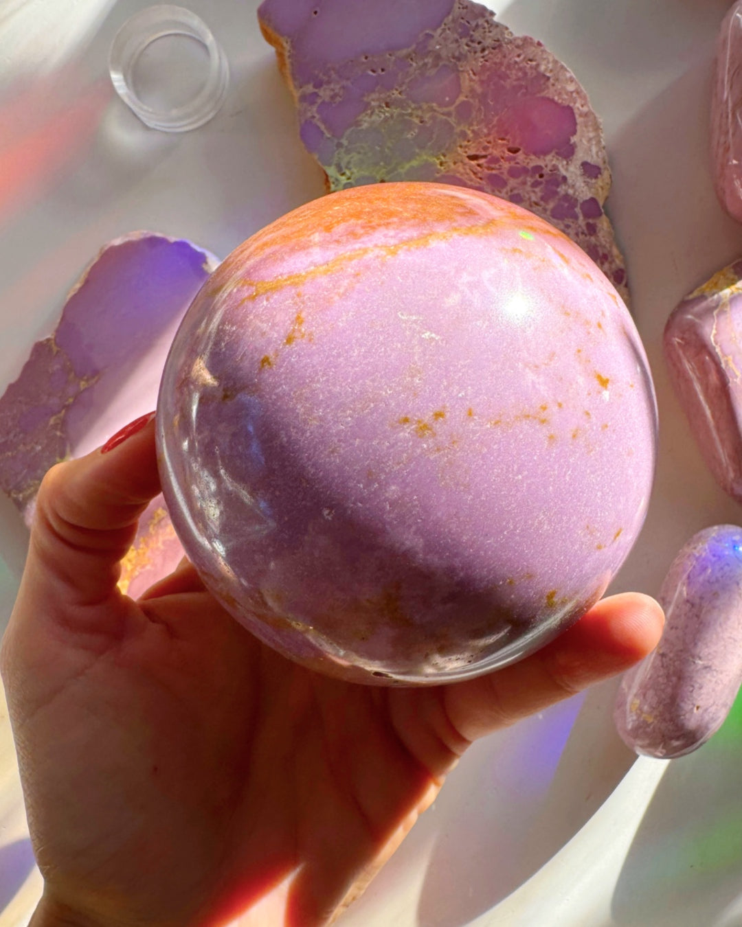 This impressive Phosphosiderite sphere showcases a rich blend of lavender and violet tones, beautifully accented by veins of golden inclusions that run throughout. A striking piece from Peru, this large super quality sphere emanates calming and serene energy, making it an ideal centerpiece for any space dedicated to relaxation or meditation.