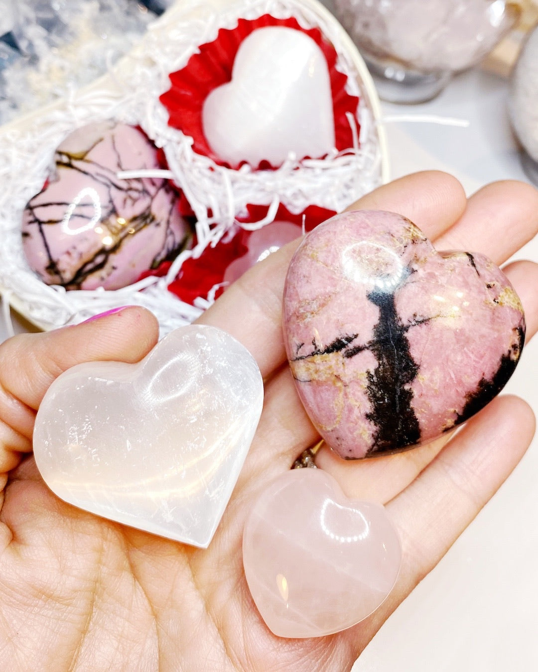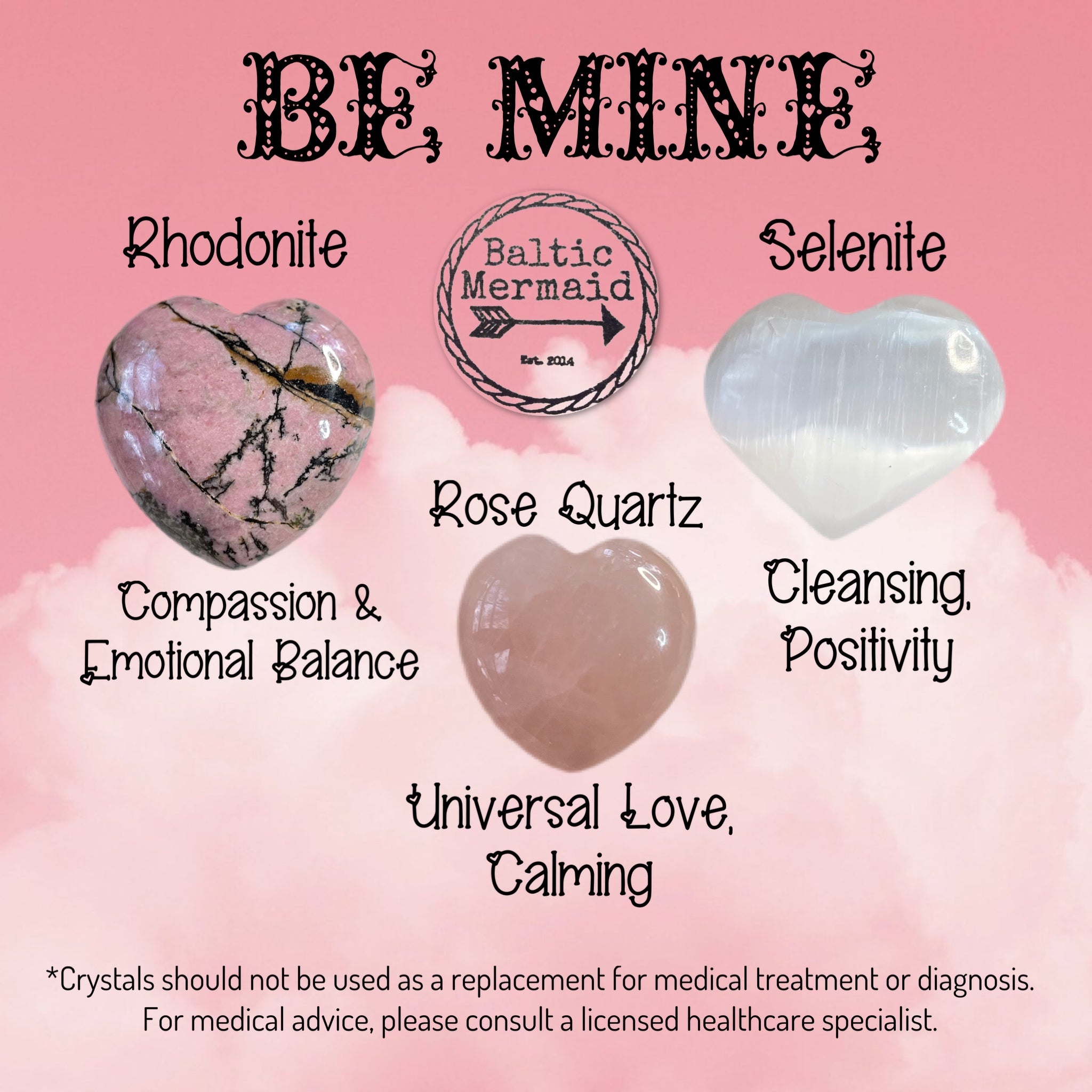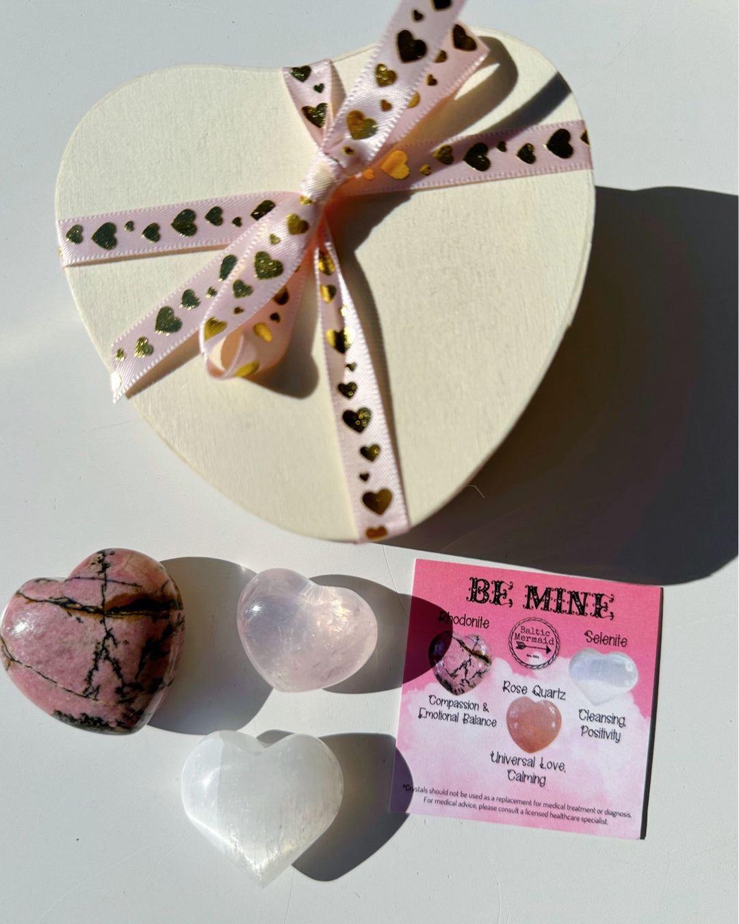 The All The Hearts Valentine Crystal Set includes a a Little Rose Quartz Heart, Selenite Heart and a beautiful Rhodonite Heart. All three come in a 4” heart shaped poplar bentwood box that is great for keeping all kinds of treasures in.