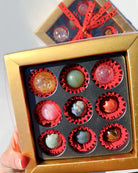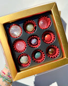 All 9 spheres are packaged in a gold candy box, each in their own little space, tied with a red ribbon with gold hearts on it.