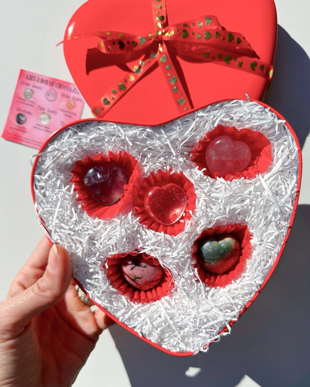 All 5 AA 1.25” Heart Stones come in a 6” red tin heart shaped box that is great for keeping all kinds of treasures in.